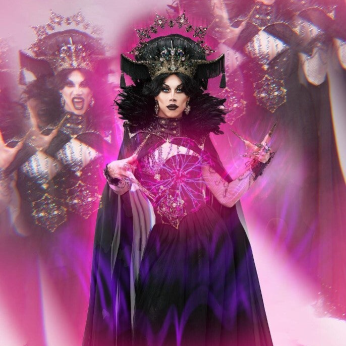 Keta Minaj wearing her witch outfit and headdress, created by Phoenix Creations during one of the episodes of RuPaus dragrace UK vs The World.