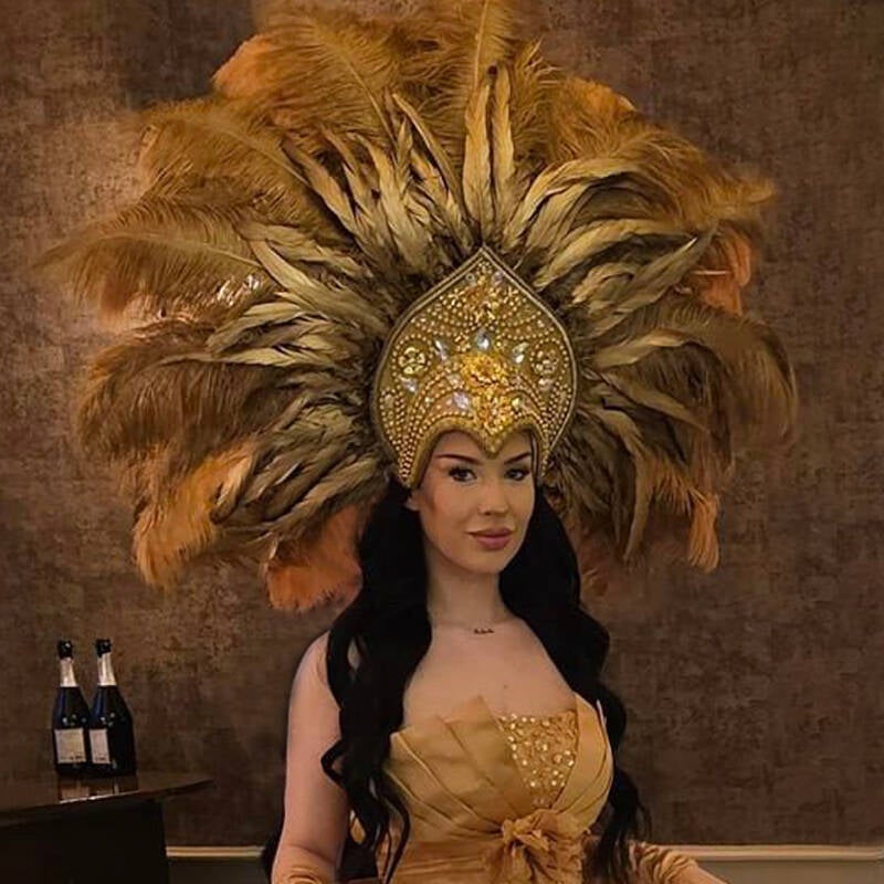 You can book this beautiful champagne lady at Xclusive Entertiainment. She is wearing a Phoenix Creations Ostrich feather headdress.