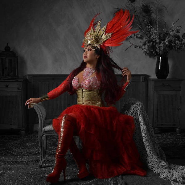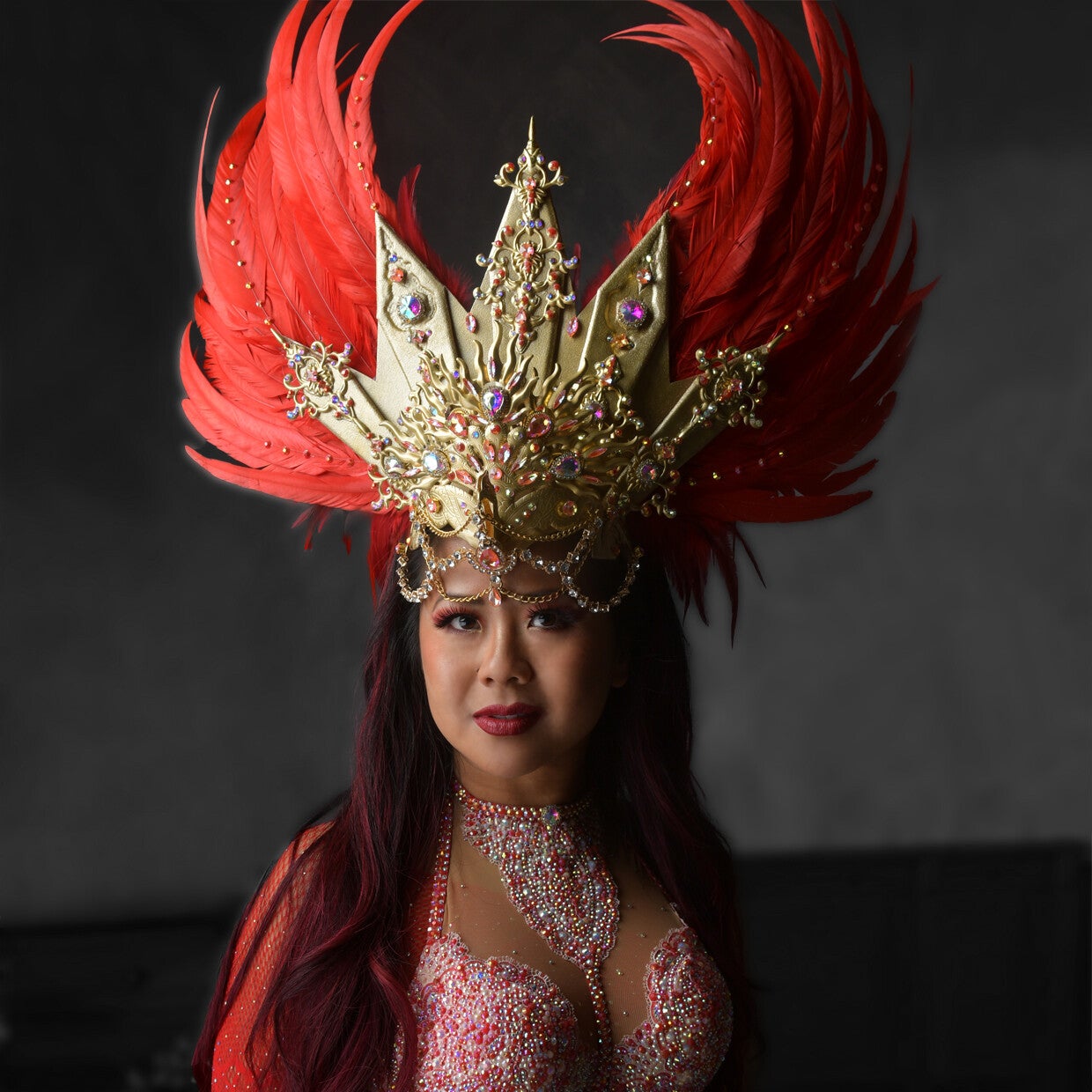 Step into the world of mythical splendor with this breathtaking crown in the sign of the phoenix. With its fiery red color, this headdress pays homage to the legendary bird that rises from the ashes, and it will make you shine like a true bird of fire.
