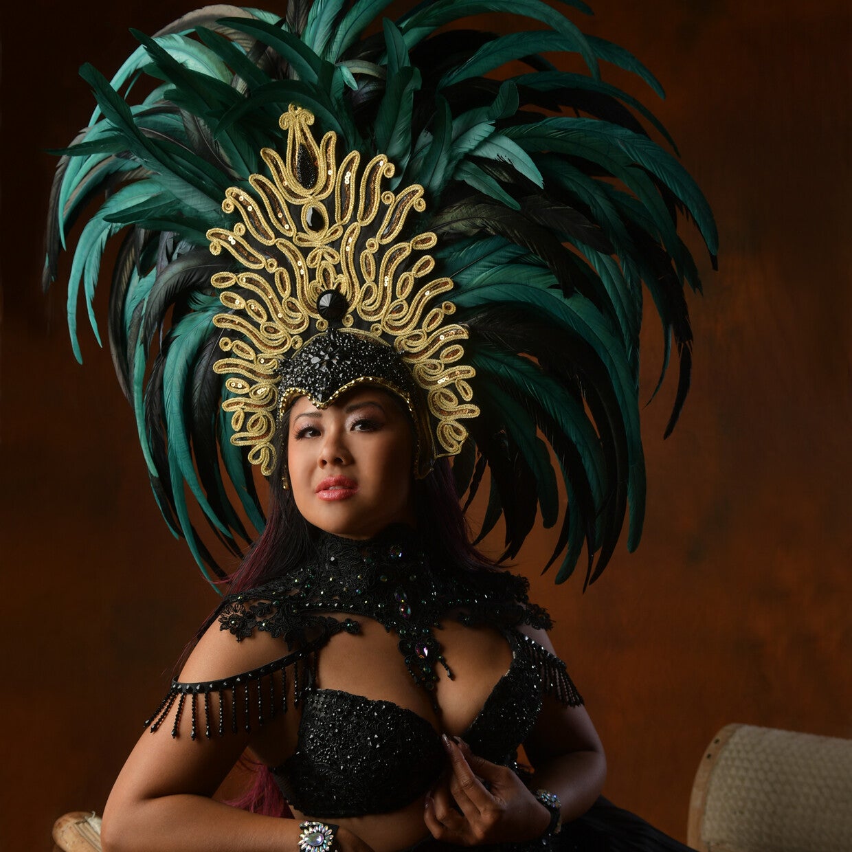 Enter the lush wilderness of the jungle with this breathtaking headdress, inspired by the abundant beauty of nature. This peerless creation, composed of vibrant green feathers and embellished with beautiful gold-colored ornaments, transports you to the enchanting world of the jungle.