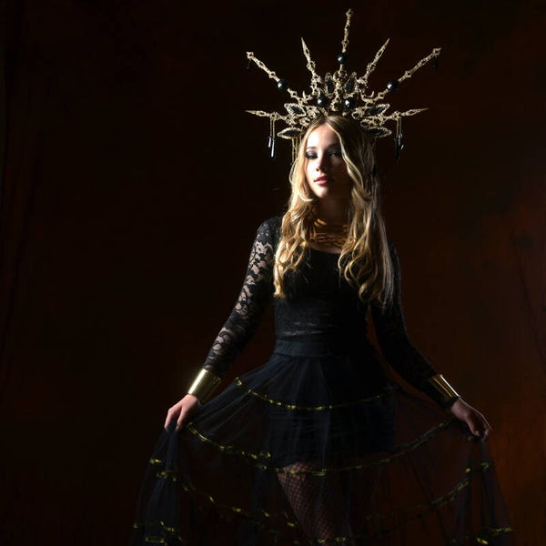 Embrace the darkness and channel your inner enchantress with this bewitching crown. With its dark allure, Estelle is a symbol of power and mystery. It exudes an aura of ancient magic and timeless elegance. Let the whispers of the night guide you as you cast a spell of fascination.