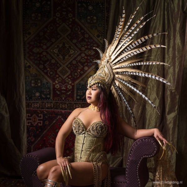 Named after the legendary queen herself, Daenerys is a symbol of power and grace. Crafted with meticulous detail and adorned with shimmering jewels and beautiful pheasant feather, she commands attention. Let your inner queen shine as you reign over any occasion with confidence and poise.