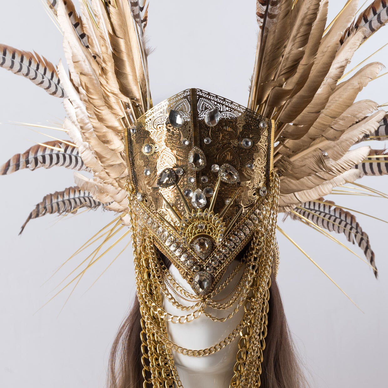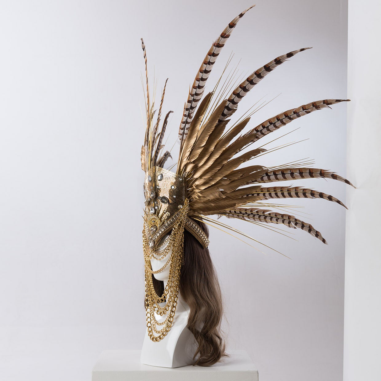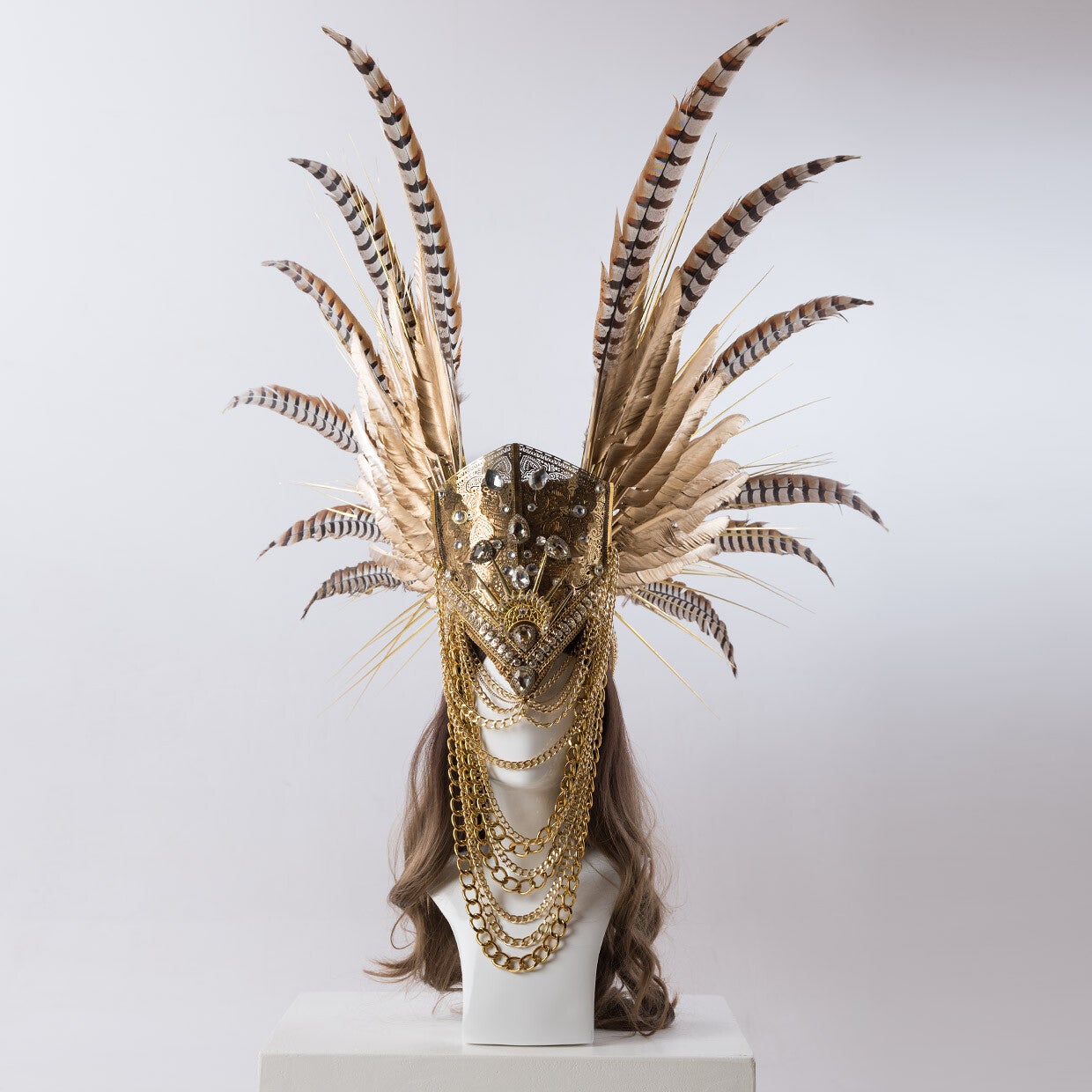 Embrace your inner warrior goddess with the majestic Hippolyta, inspired by the legendary Amazon queen herself. Crafted with long, luxurious pheasant feathers and adorned with golden chains in Valkyrie style, this headpiece embodies strength, power, and elegance. Immerse yourself in the allure of a true warrior queen.