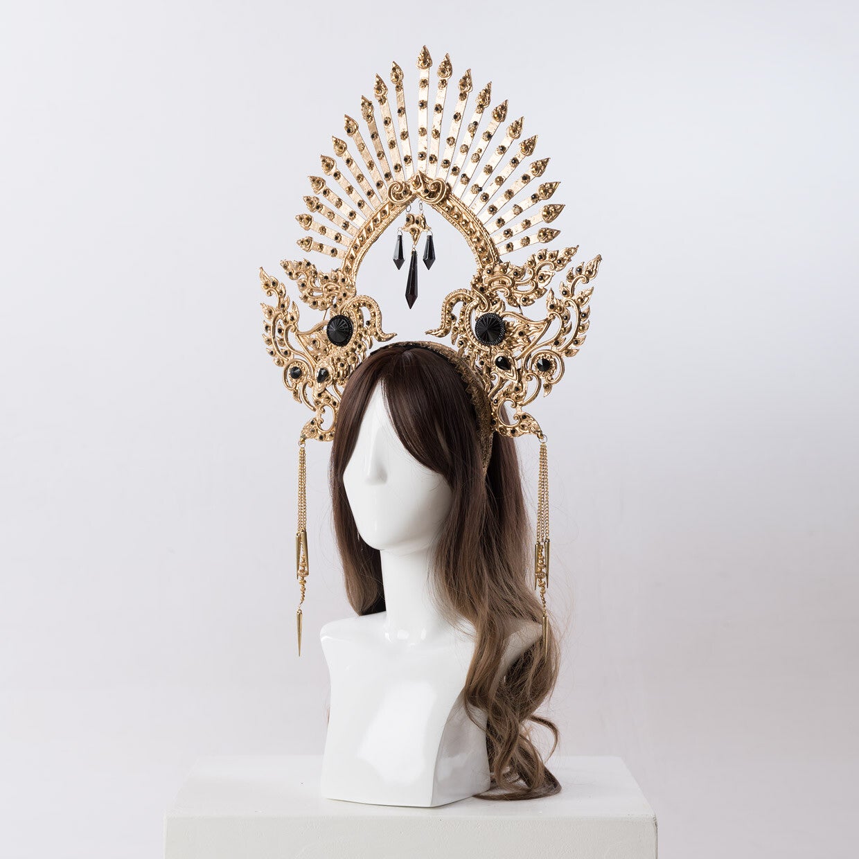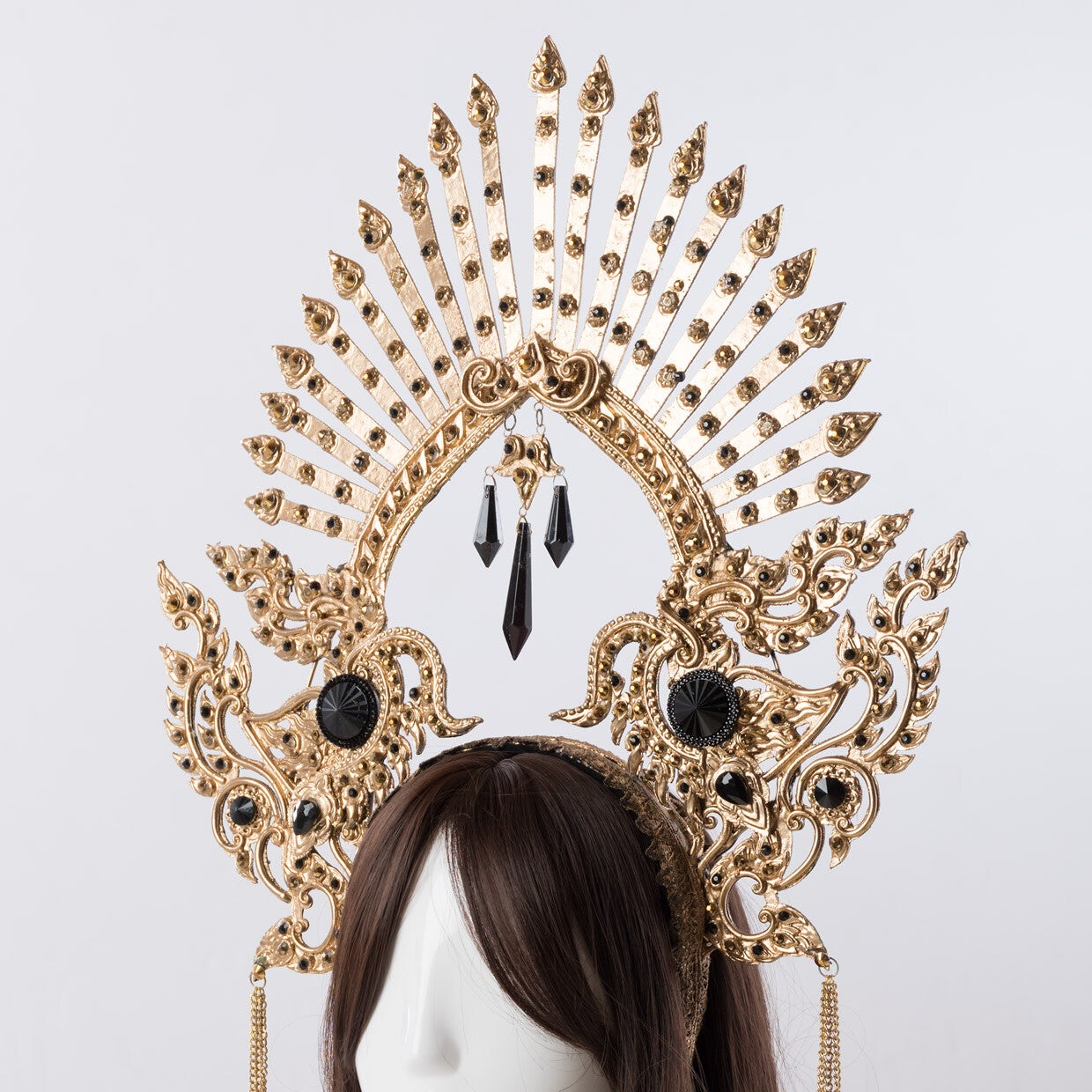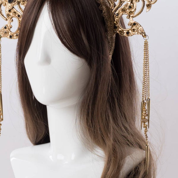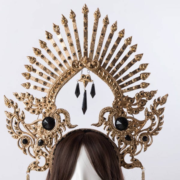 Embrace your inner darkness with Akasha, a symbol of sensuality fit for a dark princess. This captivating crown exudes power, drawing you into the mystery of the night. Let its golden elegance with black rhinestones ignite your confidence. Unleash your enchanting presence and embrace the allure of the shadows with Akasha.